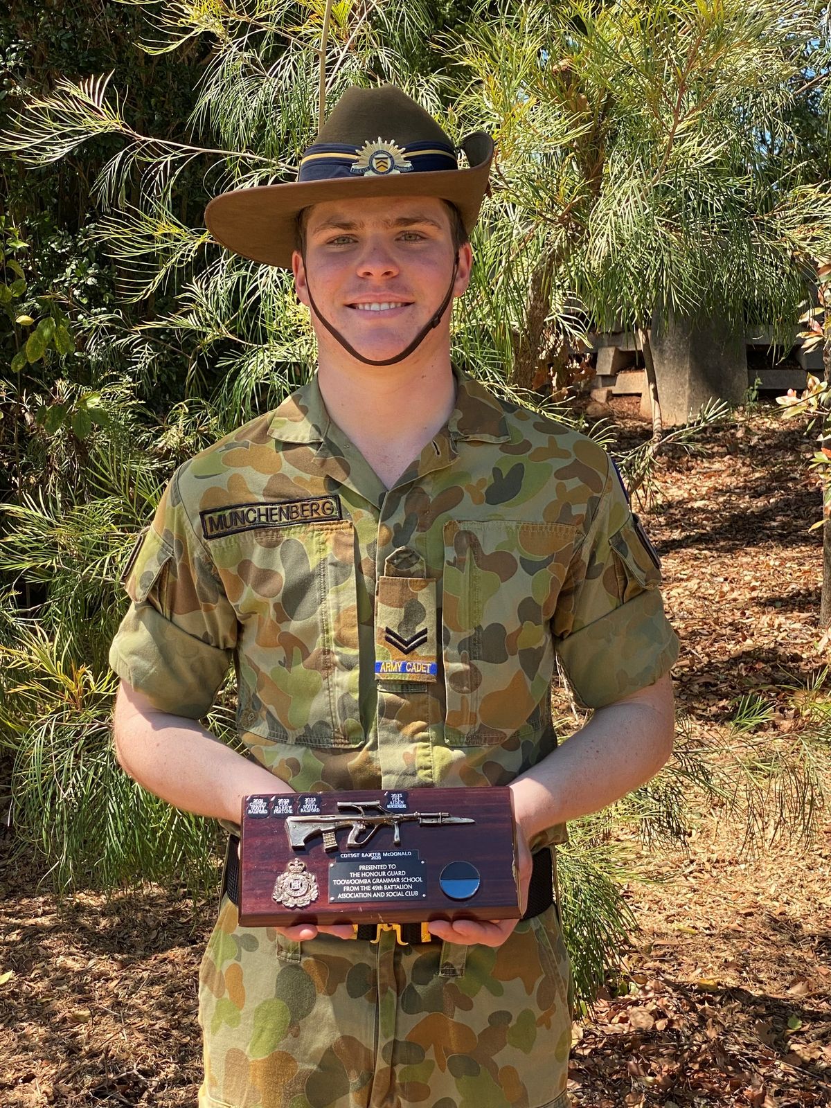 CPL Aidan Munchenberg was presented with the Honour Guard TGS 49th Battalion Association and Social Club Plaque.