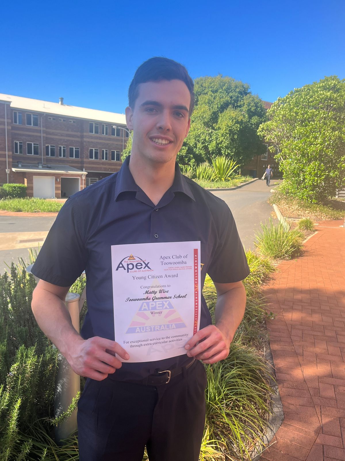 The Apex Club of Toowoomba Young Citizen Award is awarded to a male and a female Year 12 student who has performed exceptional service to the community through extra-curricular activities. Students are nominated by their school principals, shortlisted by a committee and voted on by the Apex Club. Matty was nominated for his contributions to the Pinnacle Challenge Kokoda Team, his fundraising services and his services to the School's Interact Club, among other activities.